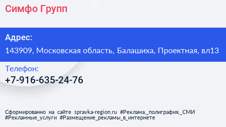 Симфо Групп по адресу 143909, Московская область, Балашиха, Проектная, вл13 в дальнейшем Организация, размещена в следующих категориях:
