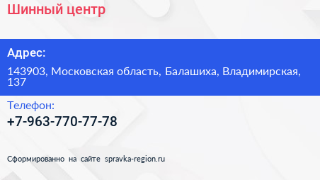 Шинный центр по адресу 143903, Московская область, Балашиха, Владимирская, 137 в дальнейшем Организация, размещена в следующих категориях: