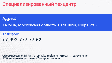 Специализированный техцентр по адресу 143904, Московская область, Балашиха, Мира, ст5 в дальнейшем Организация, размещена в следующих категориях: