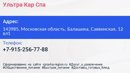 Ультра Кар Спа по адресу 143985, Московская область, Балашиха, Саввинская, 12 вл1 в дальнейшем Организация, размещена в следующих категориях: