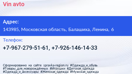 Vin-avto по адресу 143985, Московская область, Балашиха, Ленина, 6 в дальнейшем Организация, размещена в следующих категориях:
