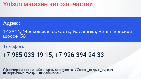 Yulsun, магазин автозапчастей по адресу 143914, Московская область, Балашиха, Вишняковское шоссе, 56 в дальнейшем Организация, размещена в следующих категориях: