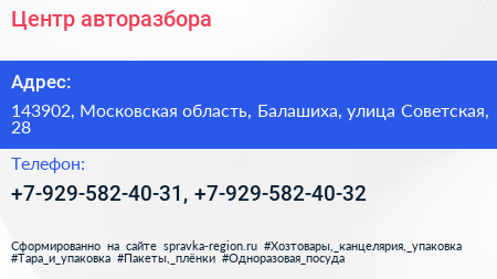 Центр авторазбора по адресу 143902, Московская область, Балашиха, улица Советская, 28 в дальнейшем Организация, размещена в следующих категориях: