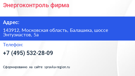 Энергоконтроль, фирма по адресу 143912, Московская область, Балашиха, шоссе Энтузиастов, 5а в дальнейшем Организация, размещена в следующих категориях: