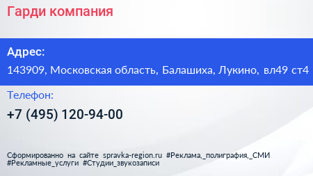 Гарди, компания по адресу 143909, Московская область, Балашиха, Лукино, вл49 ст4 в дальнейшем Организация, размещена в следующих категориях: