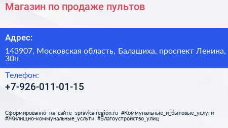 Магазин по продаже пультов по адресу 143907, Московская область, Балашиха, проспект Ленина, 30н в дальнейшем Организация, размещена в следующих категориях: