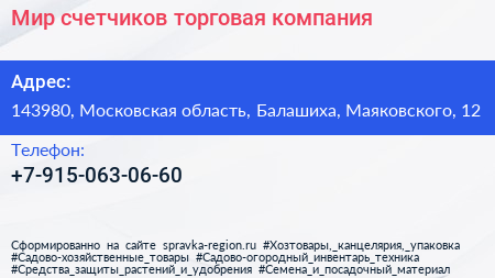 Мир счетчиков, торговая компания по адресу 143980, Московская область, Балашиха, Маяковского, 12 в дальнейшем Организация, размещена в следующих категориях: