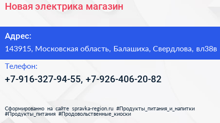 Новая электрика, магазин по адресу 143915, Московская область, Балашиха, Свердлова, вл38в в дальнейшем Организация, размещена в следующих категориях: