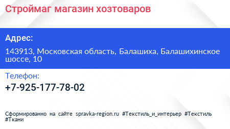Строймаг, магазин хозтоваров по адресу 143913, Московская область, Балашиха, Балашихинское шоссе, 10 в дальнейшем Организация, размещена в следующих категориях: