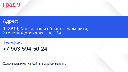 Град-9 по адресу 143914, Московская область, Балашиха, Железнодорожная 1-я, 13а в дальнейшем Организация, размещена в следующих категориях: