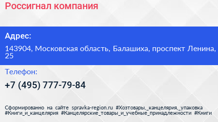 Россигнал, компания по адресу 143904, Московская область, Балашиха, проспект Ленина, 25 в дальнейшем Организация, размещена в следующих категориях: