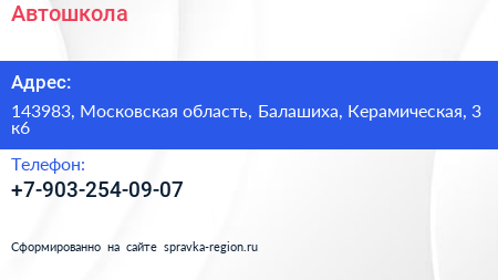 Автошкола по адресу 143983, Московская область, Балашиха, Керамическая, 3 к6 в дальнейшем Организация, размещена в следующих категориях: