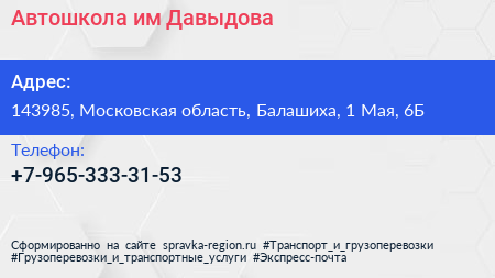Автошкола им. Давыдова по адресу 143985, Московская область, Балашиха, 1 Мая, 6Б в дальнейшем Организация, размещена в следующих категориях:
