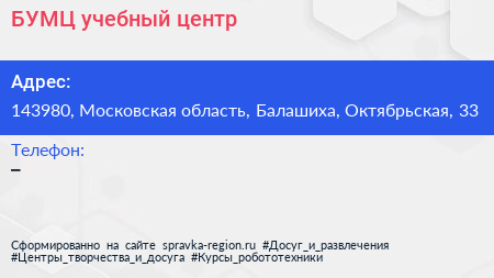 БУМЦ, учебный центр по адресу 143980, Московская область, Балашиха, Октябрьская, 33 в дальнейшем Организация, размещена в следующих категориях: