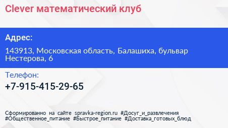 Clever, математический клуб по адресу 143913, Московская область, Балашиха, бульвар Нестерова, 6 в дальнейшем Организация, размещена в следующих категориях: