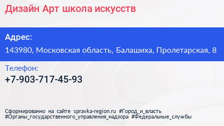 Дизайн-Арт, школа искусств по адресу 143980, Московская область, Балашиха, Пролетарская, 8 в дальнейшем Организация, размещена в следующих категориях: