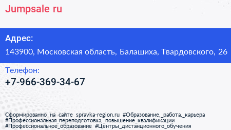 Jumpsale.ru по адресу 143900, Московская область, Балашиха, Твардовского, 26 в дальнейшем Организация, размещена в следующих категориях: