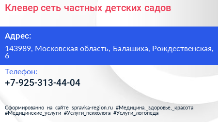 Клевер, сеть частных детских садов по адресу 143989, Московская область, Балашиха, Рождественская, 6 в дальнейшем Организация, размещена в следующих категориях:
