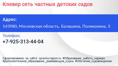 Клевер, сеть частных детских садов по адресу 143980, Московская область, Балашиха, Поликахина, 3 в дальнейшем Организация, размещена в следующих категориях: