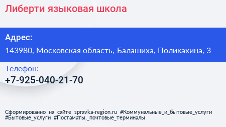 Либерти, языковая школа по адресу 143980, Московская область, Балашиха, Поликахина, 3 в дальнейшем Организация, размещена в следующих категориях: