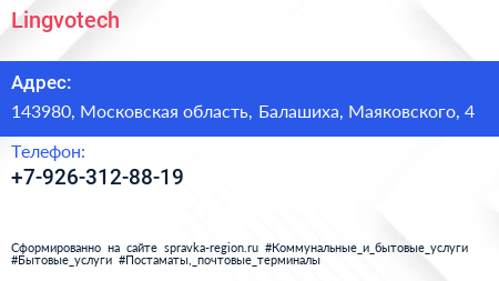 Lingvotech по адресу 143980, Московская область, Балашиха, Маяковского, 4 в дальнейшем Организация, размещена в следующих категориях: