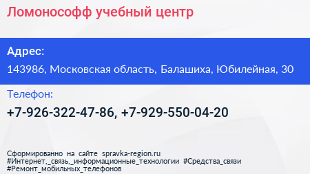 Ломонософф, учебный центр по адресу 143986, Московская область, Балашиха, Юбилейная, 30 в дальнейшем Организация, размещена в следующих категориях: