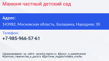 Манюня, частный детский сад по адресу 143982, Московская область, Балашиха, Народная, 30 в дальнейшем Организация, размещена в следующих категориях: