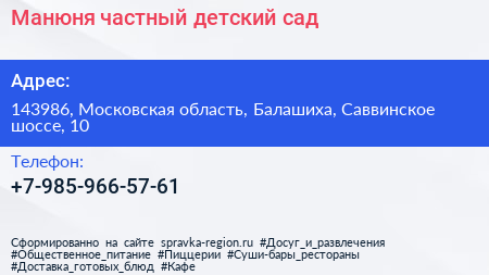 Манюня, частный детский сад по адресу 143986, Московская область, Балашиха, Саввинское шоссе, 10 в дальнейшем Организация, размещена в следующих категориях:
