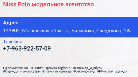 Miss Foto, модельное агентство по адресу 143905, Московская область, Балашиха, Свердлова, 19а в дальнейшем Организация, размещена в следующих категориях: