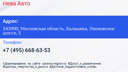 Нева-Авто по адресу 143900, Московская область, Балашиха, Леоновское шоссе, 5 в дальнейшем Организация, размещена в следующих категориях: