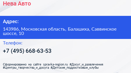 Нева-Авто по адресу 143986, Московская область, Балашиха, Саввинское шоссе, 10 в дальнейшем Организация, размещена в следующих категориях:
