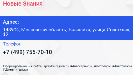 Новые Знания по адресу 143904, Московская область, Балашиха, улица Советская, 19 в дальнейшем Организация, размещена в следующих категориях: