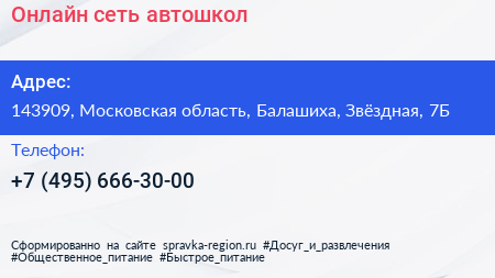 Онлайн, сеть автошкол по адресу 143909, Московская область, Балашиха, Звёздная, 7Б в дальнейшем Организация, размещена в следующих категориях: