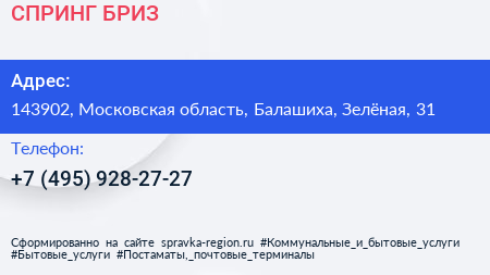 СПРИНГ-БРИЗ по адресу 143902, Московская область, Балашиха, Зелёная, 31 в дальнейшем Организация, размещена в следующих категориях: