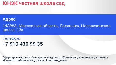 ЮНЭК, частная школа-сад по адресу 143983, Московская область, Балашиха, Носовихинское шоссе, 13а в дальнейшем Организация, размещена в следующих категориях: