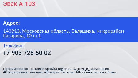 Эвак А-103 по адресу 143913, Московская область, Балашиха, микрорайон Гагарина, 10 ст1 в дальнейшем Организация, размещена в следующих категориях: