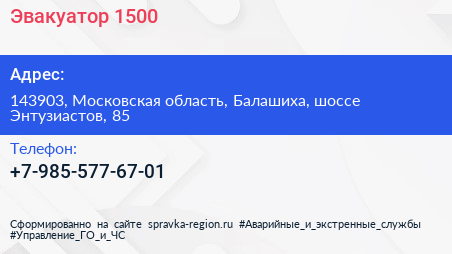 Эвакуатор 1500 по адресу 143903, Московская область, Балашиха, шоссе Энтузиастов, 85 в дальнейшем Организация, размещена в следующих категориях: