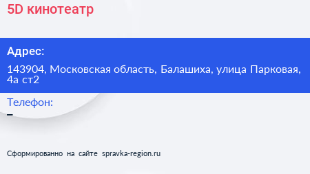 5D, кинотеатр по адресу 143904, Московская область, Балашиха, улица Парковая, 4а ст2 в дальнейшем Организация, размещена в следующих категориях: