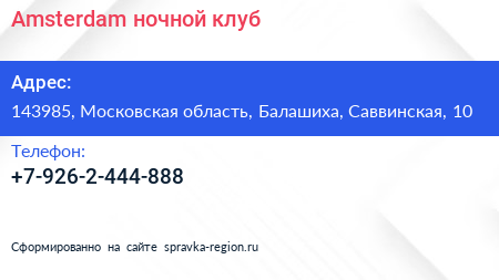 Amsterdam, ночной клуб по адресу 143985, Московская область, Балашиха, Саввинская, 10 в дальнейшем Организация, размещена в следующих категориях:
