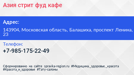 Азия стрит фуд, кафе по адресу 143904, Московская область, Балашиха, проспект Ленина, 23 в дальнейшем Организация, размещена в следующих категориях: