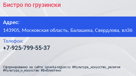 Бистро по-грузински по адресу 143905, Московская область, Балашиха, Свердлова, вл36 в дальнейшем Организация, размещена в следующих категориях:
