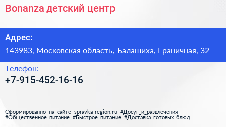 Bonanza, детский центр по адресу 143983, Московская область, Балашиха, Граничная, 32 в дальнейшем Организация, размещена в следующих категориях: