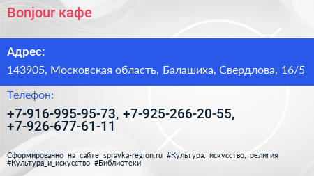 Bonjour, кафе по адресу 143905, Московская область, Балашиха, Свердлова, 16/5 в дальнейшем Организация, размещена в следующих категориях: