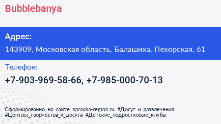 Bubblebanya по адресу 143909, Московская область, Балашиха, Пехорская, 61 в дальнейшем Организация, размещена в следующих категориях: