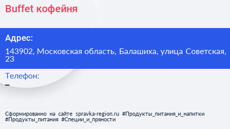 Buffet, кофейня по адресу 143902, Московская область, Балашиха, улица Советская, 23 в дальнейшем Организация, размещена в следующих категориях: