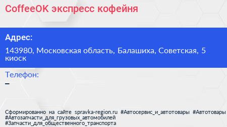 CoffeeOK, экспресс-кофейня по адресу 143980, Московская область, Балашиха, Советская, 5 киоск в дальнейшем Организация, размещена в следующих категориях: