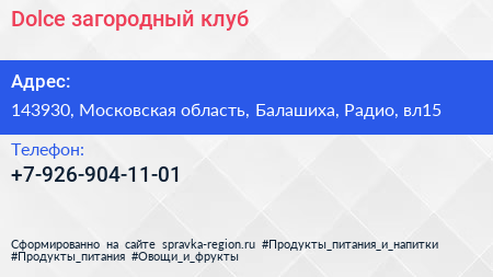 Dolce, загородный клуб по адресу 143930, Московская область, Балашиха, Радио, вл15 в дальнейшем Организация, размещена в следующих категориях: