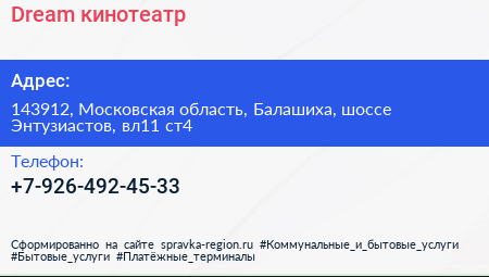 Dream, кинотеатр по адресу 143912, Московская область, Балашиха, шоссе Энтузиастов, вл11 ст4 в дальнейшем Организация, размещена в следующих категориях: