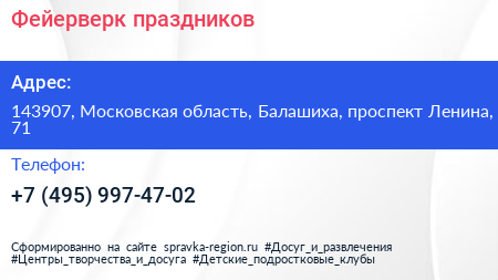 Фейерверк праздников по адресу 143907, Московская область, Балашиха, проспект Ленина, 71 в дальнейшем Организация, размещена в следующих категориях: