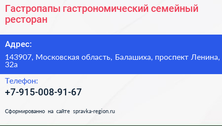 Гастропапы, гастрономический семейный ресторан по адресу 143907, Московская область, Балашиха, проспект Ленина, 32а в дальнейшем Организация, размещена в следующих категориях: